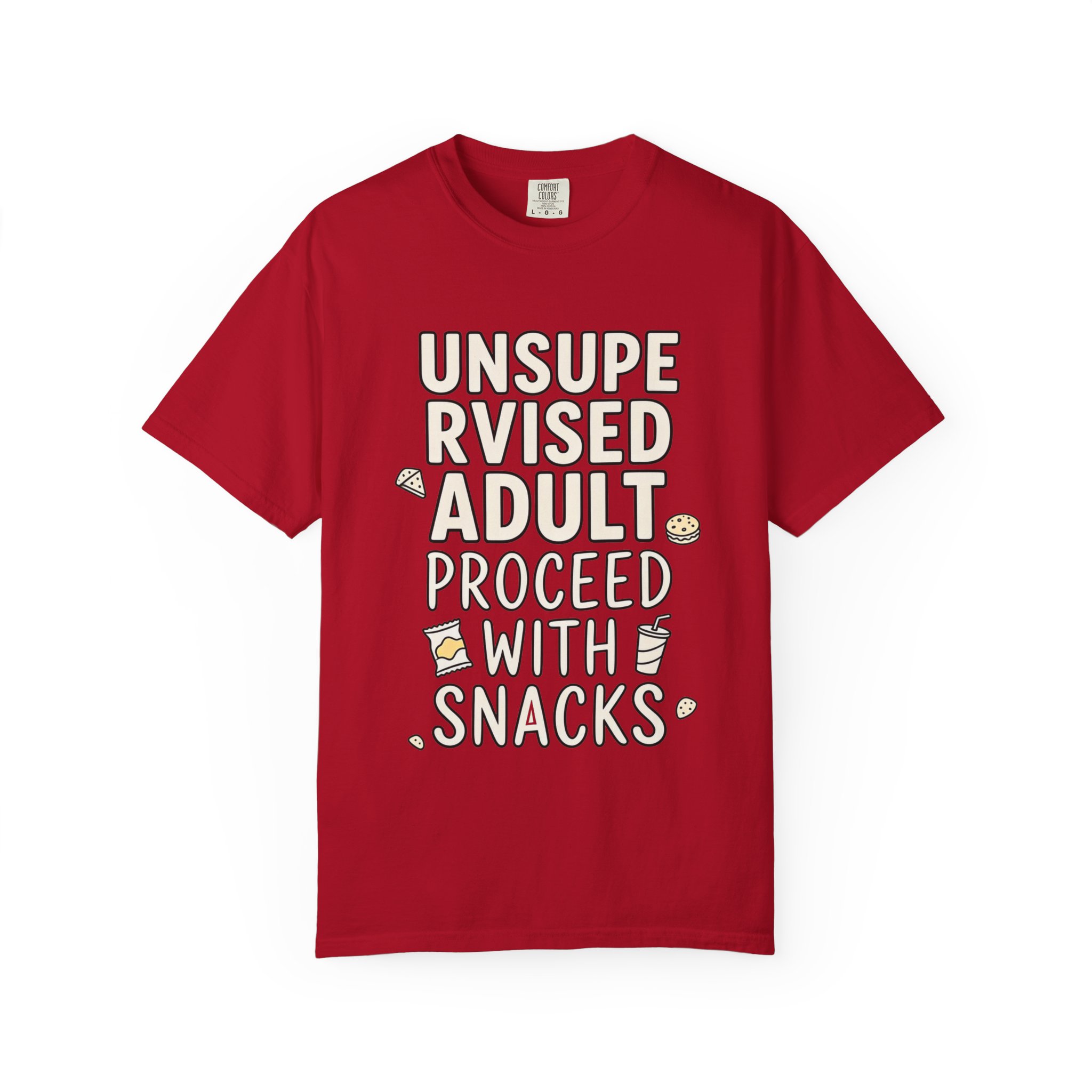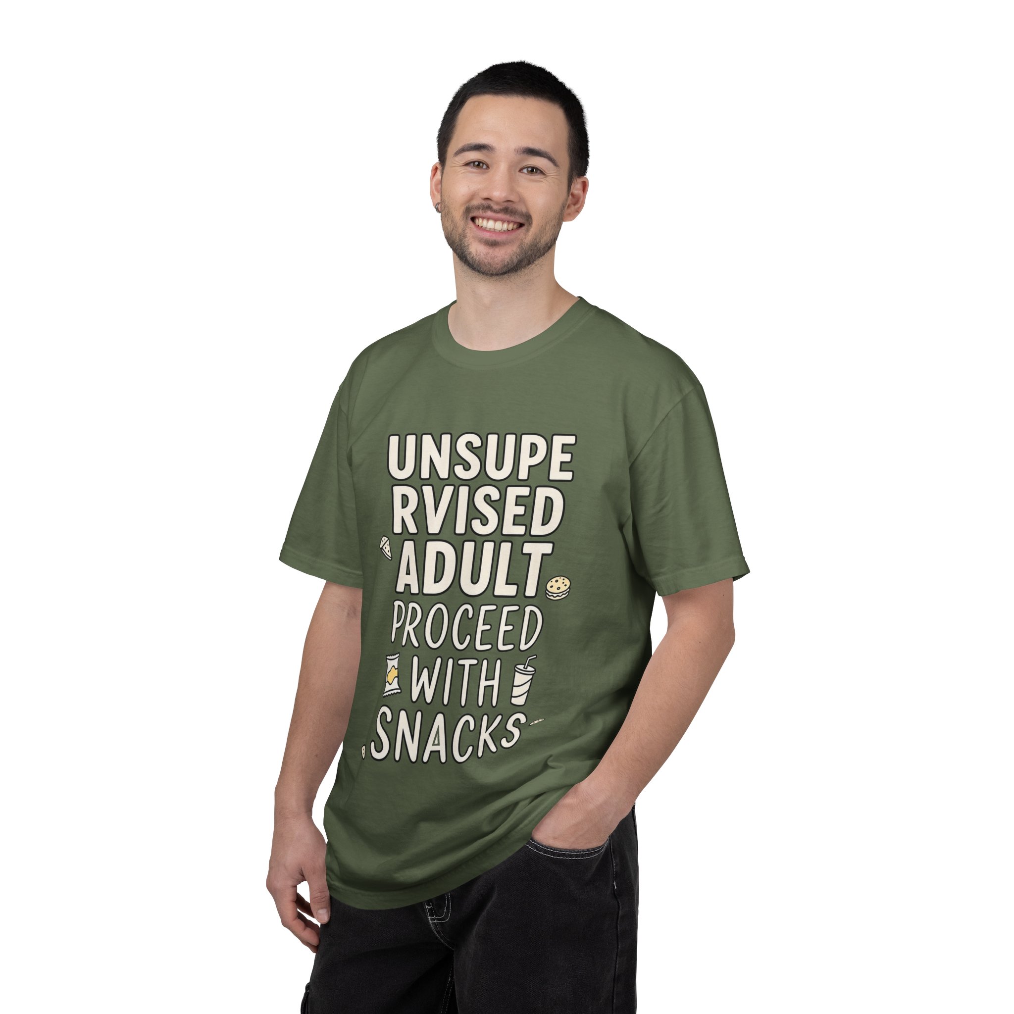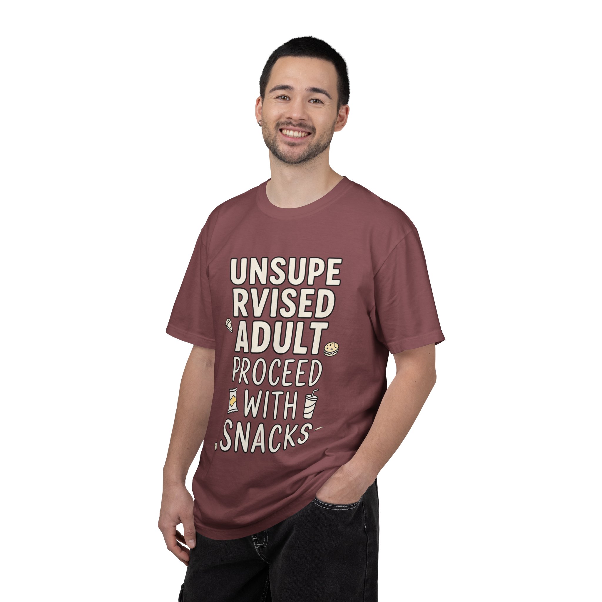 This relaxed, garment-dyed tee reads like a cozy note from someone who grew up and kept their snack drawer intact. Soft, broken-in cotton and a subtle washed finish make it feel lived-in from the first wear. The hand-drawn lettering—’UNSUPERVISED ADULT — PROCEED WITH SNACKS’—and tiny snack doodles bring a playful, gentle humor that settles into everyday life: slow mornings with coffee, low-key movie nights, and weekends spent puttering around the house. It’s breathable and substantial, so it wears well through errands, lounging, and casual meetups. Choose a faded hue to enhance that thrifted, comfortable vibe; the roomy cut layers easily under jackets or stands on its own as the relaxed centerpiece of your outfit.